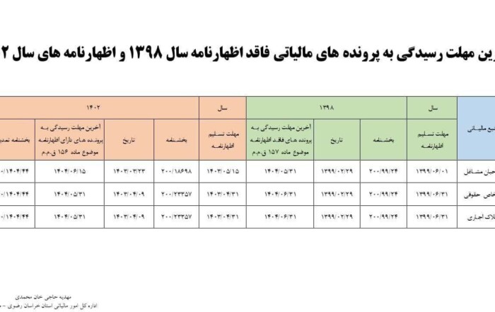آخرین مهلت رسیدگی به پروندههای مالیاتی فاقد اظهارنامه سال ١٣٩٨ و اظهارنامه های سال ۱۴۰۲ به شرح عکس است.