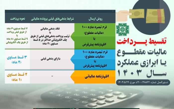 شرایط تقسیط پرداخت مالیات مقطوع یا ابرازی سال ۱۴۰۳ در تصویر آورده شده است.